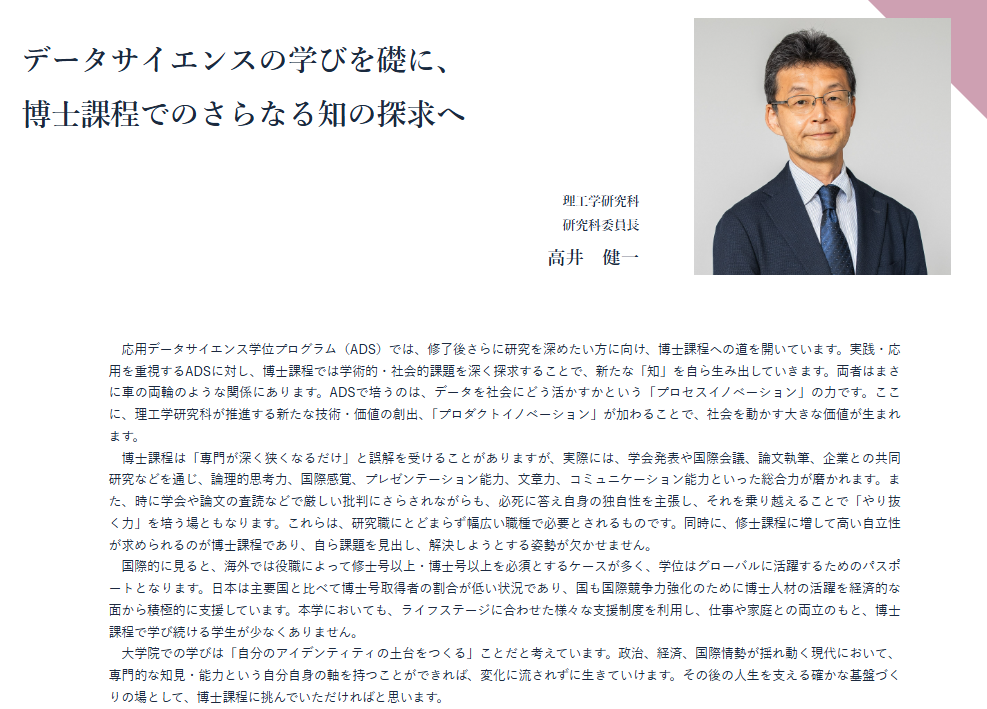 理工学研究科委員長の高井健一教授より、博士課程への接続についてのメッセージをいただきました