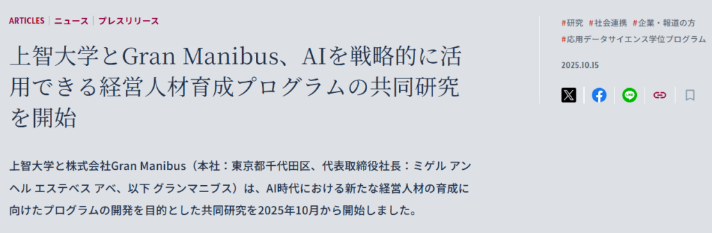 上智大学と株式会社Gran Manibus(本社:東京都千代田区、代表取締役社長:ミゲル アンヘル エステベス アベ、以下 グランマニブス)は、AI時代における新たな経営人材の育成に向けたプログラムの開発を目的とした共同研究を2025年10月から開始しました。
