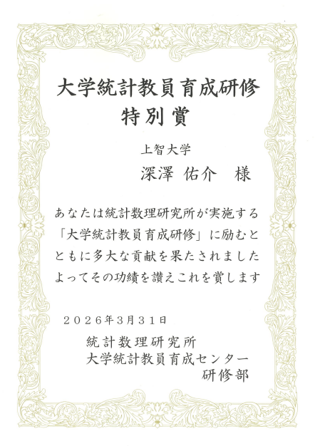大学院応用データサイエンス学位プログラムの深澤佑介准教授が、統計数理研究所 大学統計教員育成センターの「大学統計教員育成研修 特別賞」を受賞しました。本賞は、統計数理研究所が推進する「大学統計教員育成研修」において、研修への積極的な参加および顕著な貢献を行った教員に対して授与されるものです。